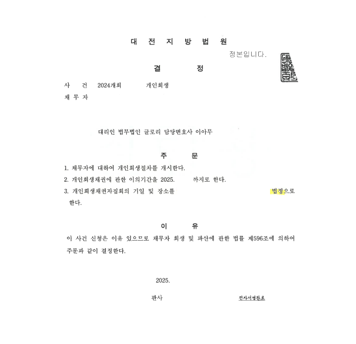 법원에서는 저희 글로리의 주장을 받아들여 변제율 21.7%의 좋은 조건으로 개시결정까지 받을 수 있었습니다.