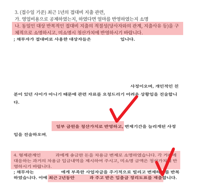 성모씨의 경우 최근 1년 동안 개인 이름에게 접대비 명목으로 사용한 금원이 19,950,000원 이었습니다. 법원에서는 해당 금원에 대하여 소명하지 못할 경우 전부를 청산가치로 반영하라고 보정이 나왔습니다. 성모씨와 개인적인 친분이 있던 사이가 아니기에 관련 자료를 받기 어려웠고, 접대비 명목으로 사용한 금원 전부를 소명할 수 없는 상황이었습니다.