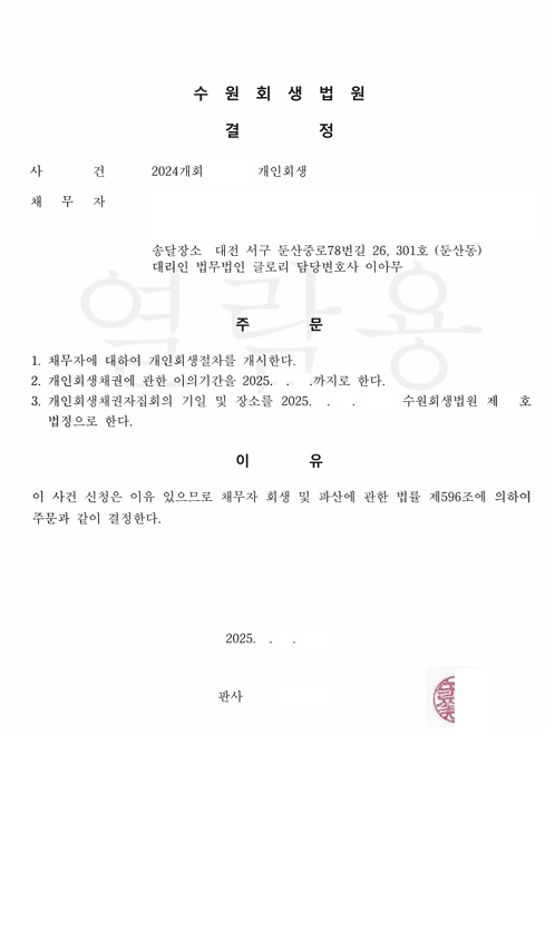 의뢰인과의 소통으로 꼼꼼하고 빠르게 보정처리를 하여 의로인도 만족하는 개시결정을 받을수 있었습니다.