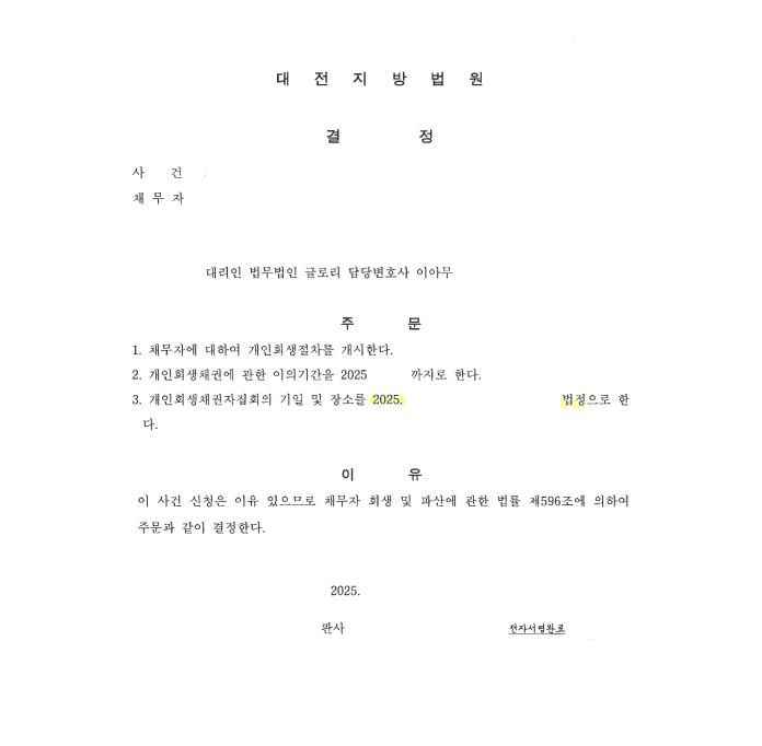 이렇듯 저희 법무법인 글로리는 고객님과의 꼼꼼한 서류 준비와 신청을 통하여 계속하여 유리한 방향으로 사건일 진행될 수 있도록 다방면으로 방안을 찾아나가고 있으며, 좋은 조건으로 개시결정까지 받을 수 있도록 최선을 다하고 있습니다.
