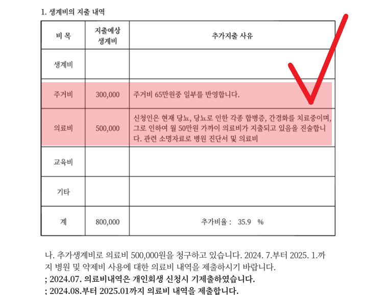 정모씨의 경우 불규칙한 생활과 스트레스로 인하여 체중이 30킬로 이상 증가하며 우울증, 당뇨 및 각종 합병증이 왔습니다. 저희 법무법인 글로리에서는 정모씨의 상황을 자세히 들었고, 법원에 의료비에 대하여 추가생계비 50만원을 요청하였습니다. 또한 거주지에 대하여 추가생계비 30만원을 추가 요청하였습니다.