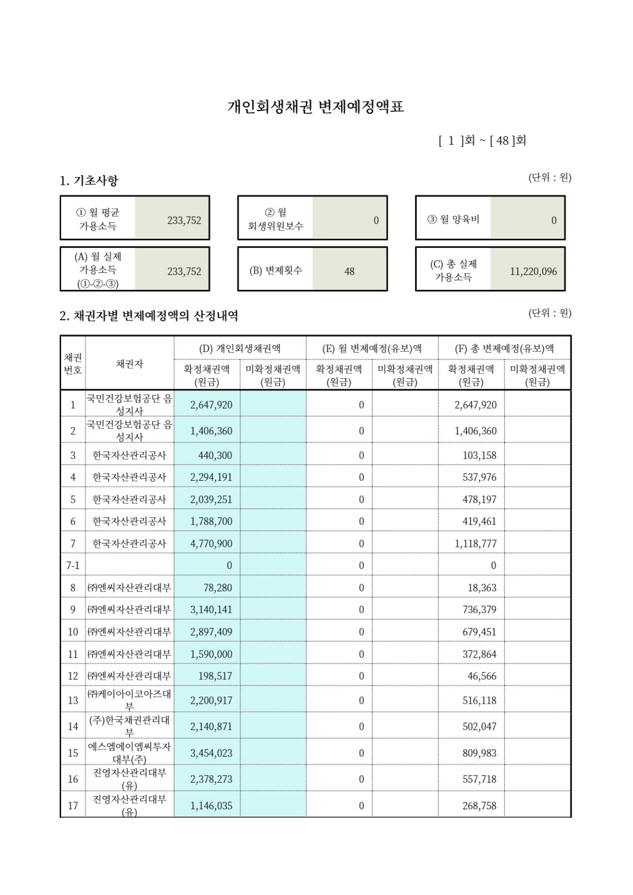 그결과 변제율 32.4% 월 변제금 233,752원이라는 좋은 조건으로 개시 결정까지 받을 수 있었습니다.