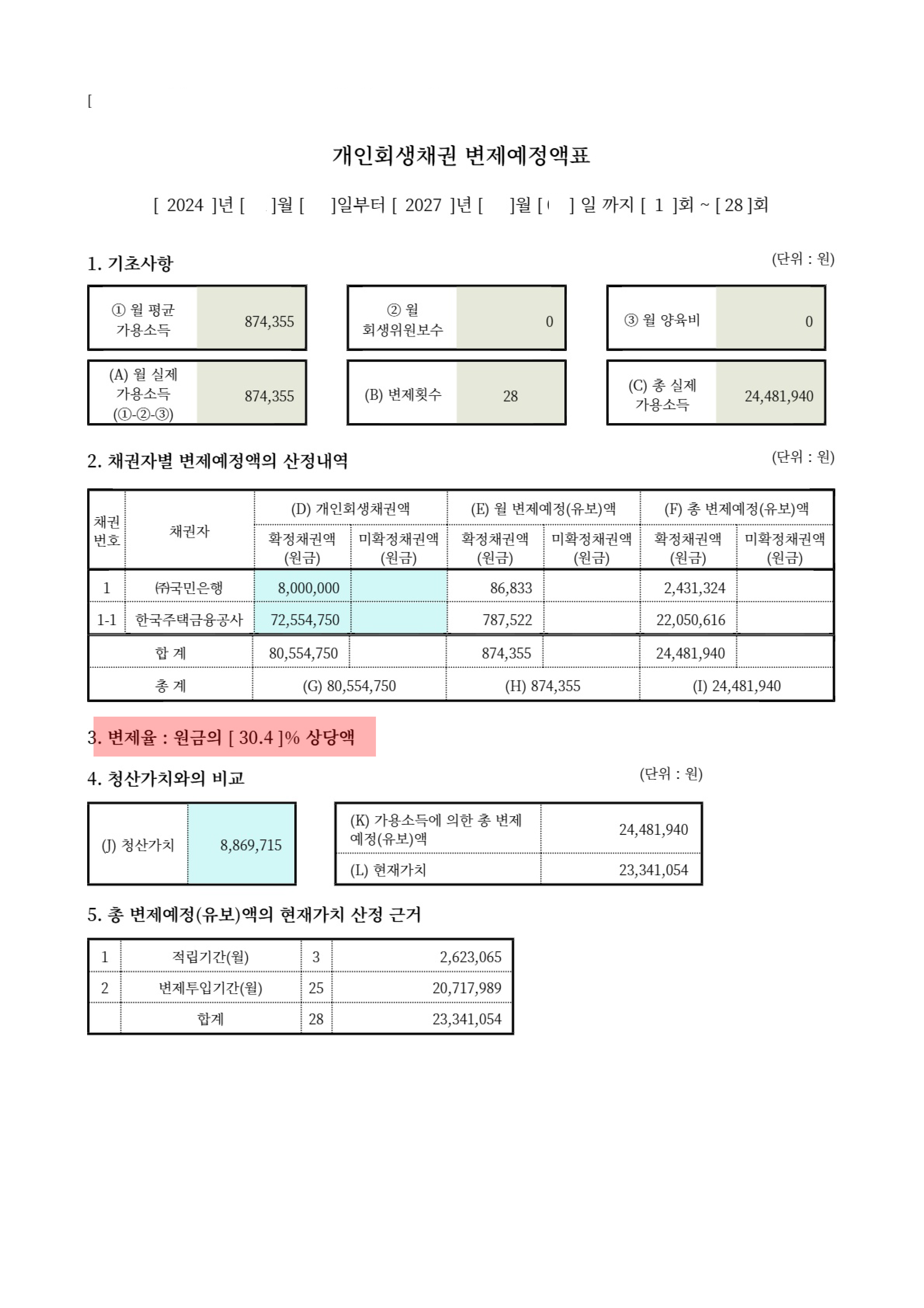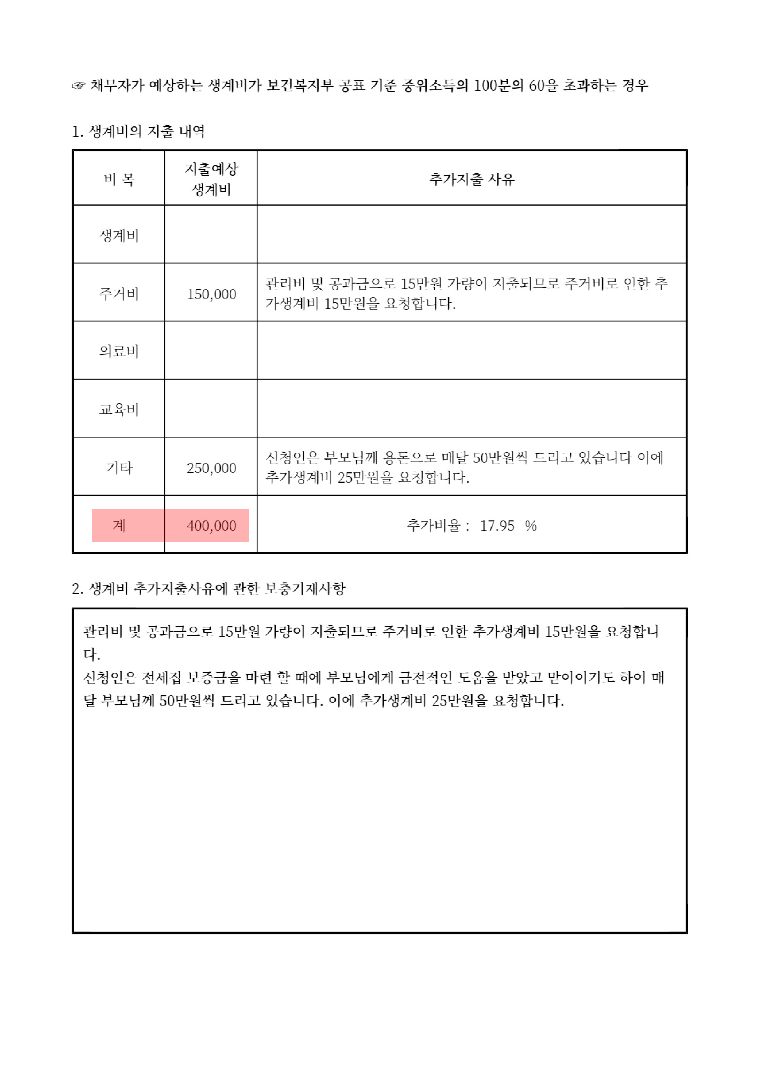 그로 인해 간단한 보정을 거쳐서 28개월 변제, 추가 생계비 40만 원을 인정 받아 총 채무액의 70%를 탕감 받는 좋은 조건으로 개시 결정을 받아드렸습니다.