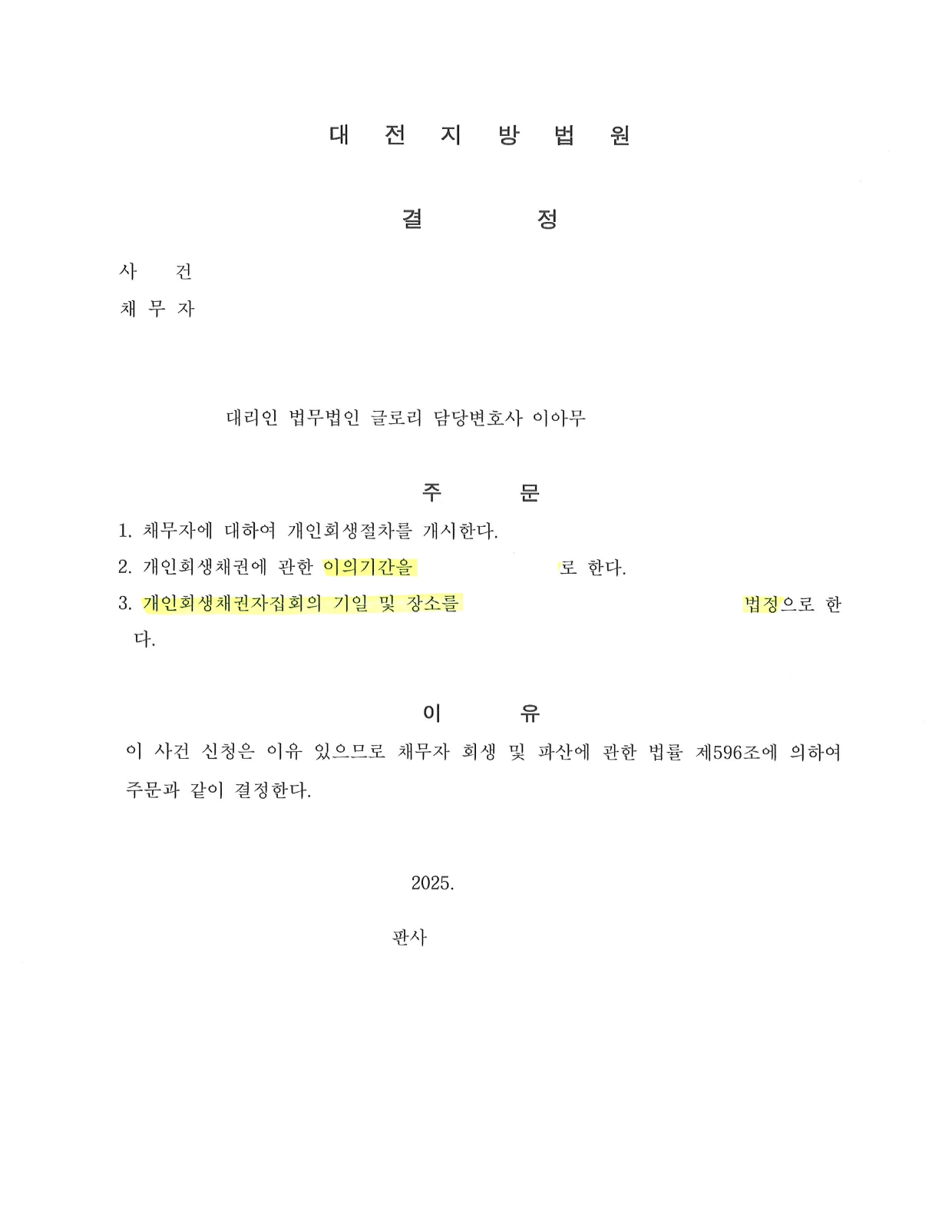 그로 인하여 주식 투자 실패로 인한 신청임에도 불구하고 변제기간 36개월 , 원금의 40.7% 변제율 , 단 1번의 보정으로 개시결정까지 받아드렸습니다.