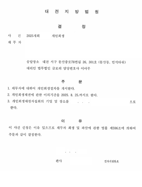 이 고비를 넘기기 위해 지인으로부터 추천받은 상가분양을 받게외어 분양이 잘 이루어 진다면 모든 채무를 청산에 가능성이 보였으나 코로나로 인해 금리인상등 사회적 영향을 심하게 받기 시작하며 모든 대출을 끌어들여 받아 진행한 분양권은 분양 포기라는 결과만 얻게 되었습니다. 김씨 부부는 좋아질 기미가 보이지 않았고, 한줄기 빛처럼 개인회생 제도를 알게되어 저희 법무법인 글로리를 찾아와주셨습니다.