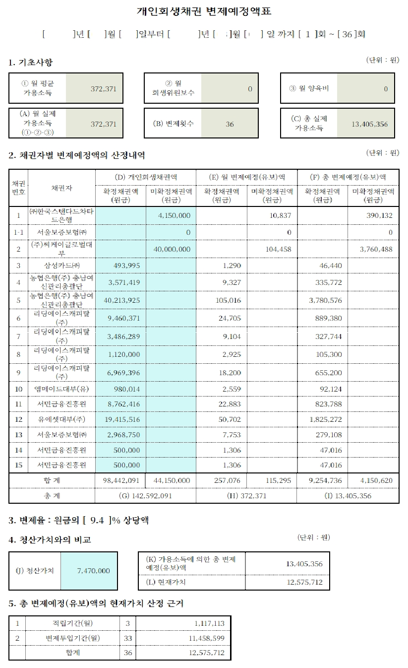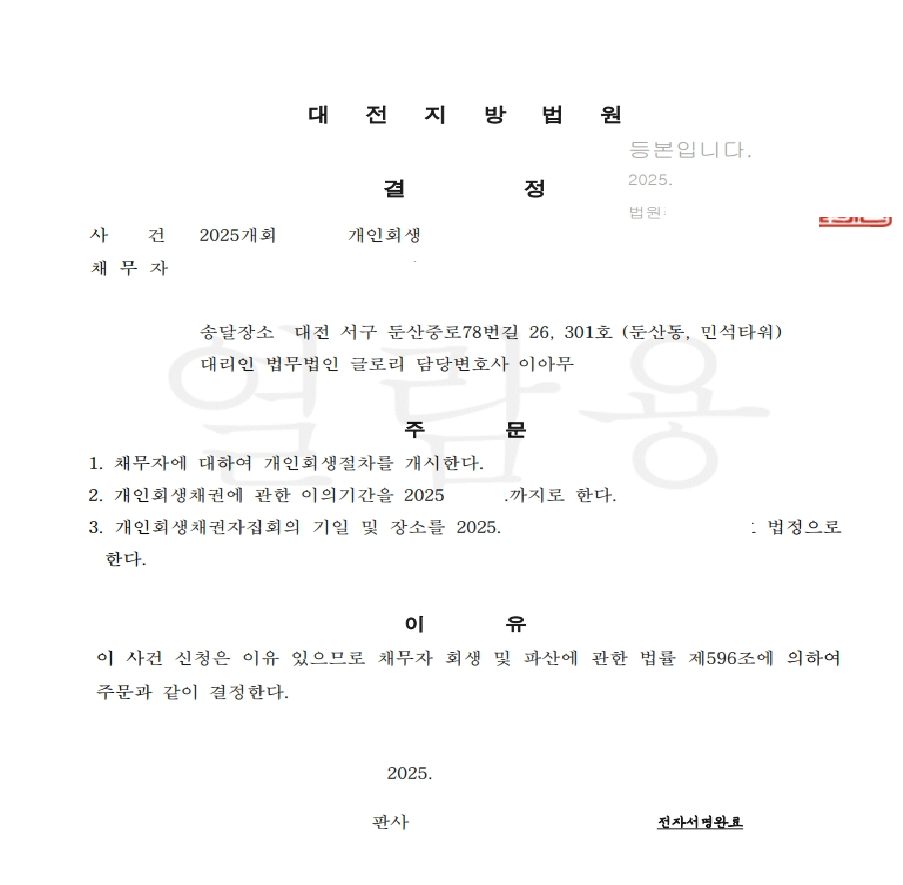 저희 법무법인 글로리는 강동석(가명)님의 힘든 상황을 고려하고, 다시금 아픔이 반복되지 않도록 또한, 최소한 변제금으로 변제를 도와드릴 수 있도록 노력하였습니다. 갑작스러운 전셋집 경매와, 지인으로부터 사기를 당하여 피해자가 되었던 상황입니다. 저희는 다양한 자료와 노하우로 의뢰인에게 유리한 방향으로 서류를 준비했으며, 부채증명발급사를 통하여 서류들 역시 빠르게 준비하여 신청하였으며, 금지명령도 받았습니다. 그러나 강동석(가명)님의 수입은 비교적 높은 편이었으나, 강동석(가명)님의 현제의 상황과 변제의 의지에 대하여 법원에 잘 어필함으로써, 부양가족 2명을 인정받았으며, 결국 추가 보정 없이 총 채무의 9.4%를 변제하며, 원금의 90.6%를 탕감받는데 성공하였습니다. 고객님께서도 매우 만족하는 좋은 결과로 개시결정을 받을 수 있었습니다. 20년 이상의 경력을 보유한 사무장님과 실무진들이 있는 저희 법무법인 글로리는 고객님들이 만족하는 결과를 얻으실 수 있도록 최선을 다해 노력하고 있습니다.