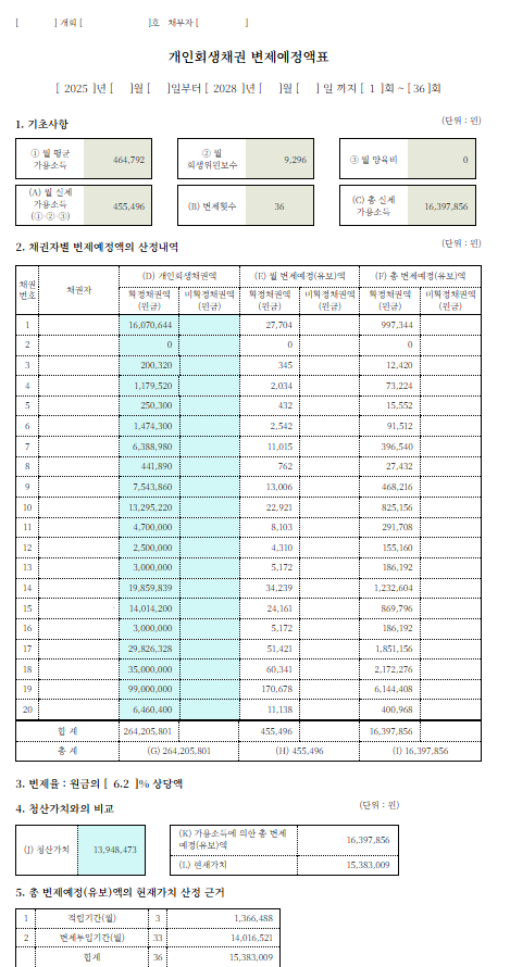 특히 법원으로부터 보정권고를 수령하자마자, 다음 날에 모든 보정자료를 완비하여 제출하였으며, 이로 인해 심리 지연 없이 사건이 신속하게 처리될 수 있었습니다. 서류 누락이나 추가 보정 없이 통과되어, 변제율 6.2%로 무리 없는 변제계획이 그대로 인정되었습니다.