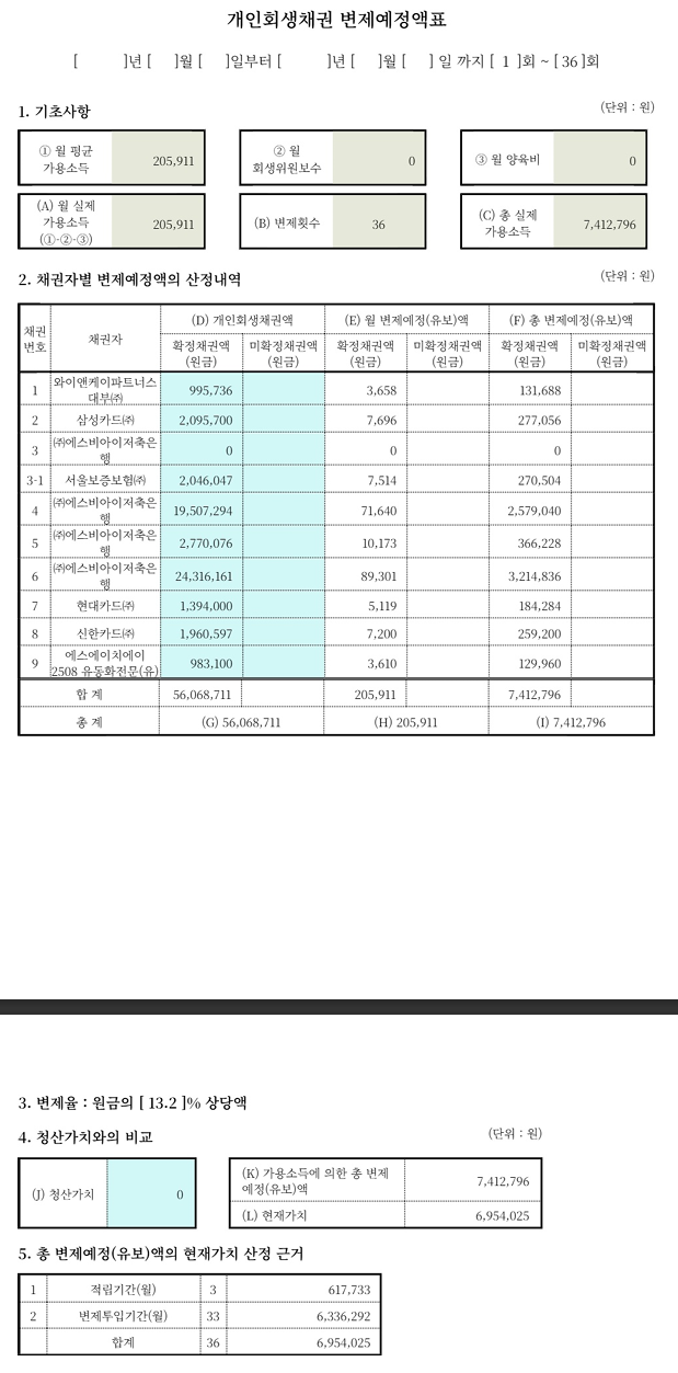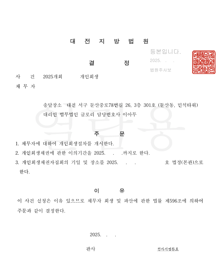 결과적으로 부담이 없는 월변제금과 낮은 변제율로 보정 없이 개시결정을 받았습니다.