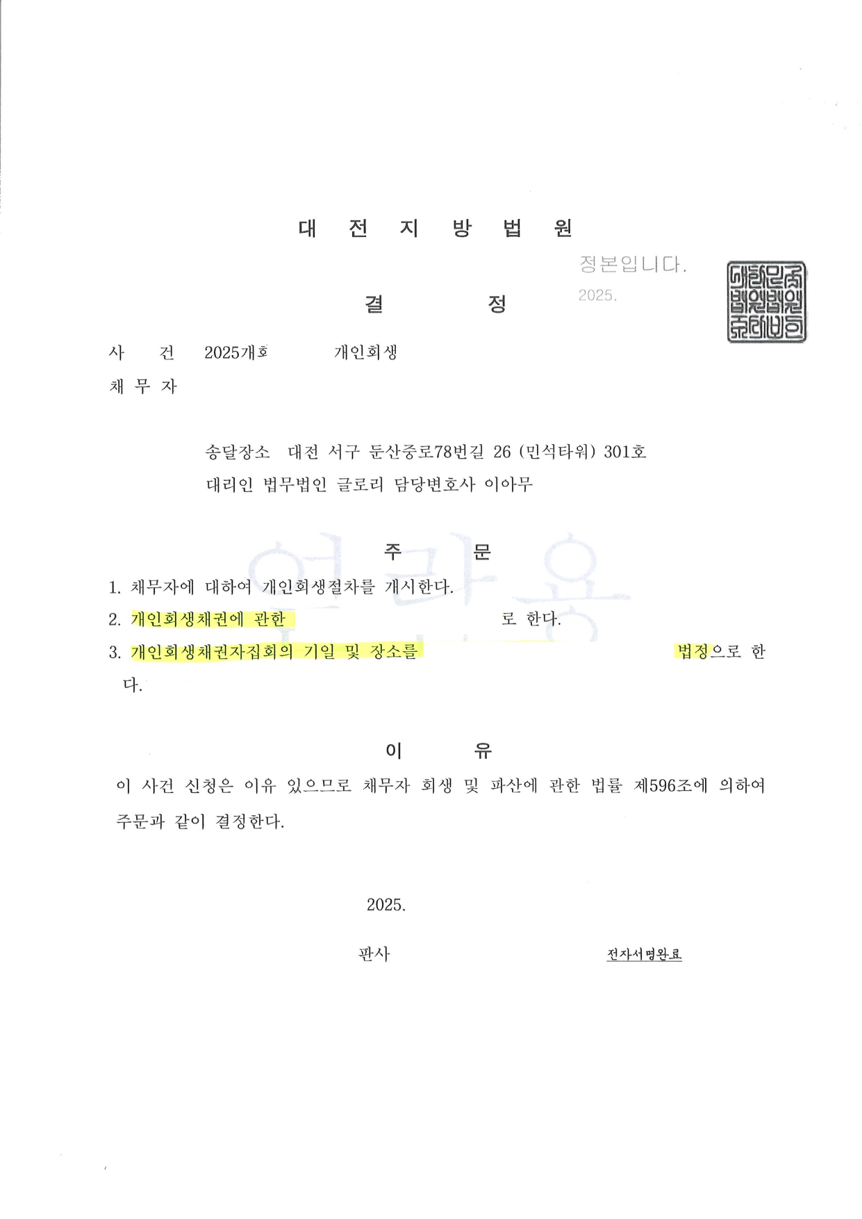 개시결정 소식을 접한 고객님께서는 오랜 시간 끌고왔던 채무 부담에서 벗어날 수 있게 되었다며 큰 안도감을 표현하셨고, 이제는 독촉 없이 본인의 소득 범위 내에서 안정적으로 변제를 이어갈 수 있게 되었습니다.