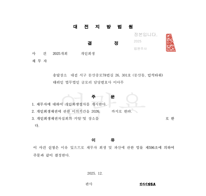 이렇듯 저희 법무법인 글로리는 고객님과의 꼼꼼한 서류 준비와 신청을 통하여 계속하여 유리한 방향으로 사건일 진행될 수 있도록 다방면으로 방안을 찾아나가고 있으며, 좋은 조건으로 개시결정까지 받을 수 있도록 최선을 다하고 있습니다.
