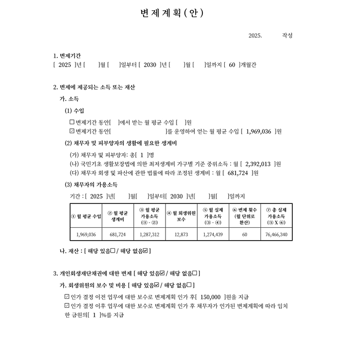 선모씨는 큰 채무에 비하여 소득은 190만원 후반대로 현재의 상황에서 채무를 감당하기 힘든 상황이었습니다. 또한 영업소득으로 소득의 변동이 커 소득이 너무 많이 잡히면 선모씨에게 불리하게 진행될 수 있는 상황이었습니다. 이에 저희 법무법인 글로리에서는 신청인에게 최대한 유리하게 소득을 산출하였고 법원에서는 글로리의 주장을 받아주셨습니다.