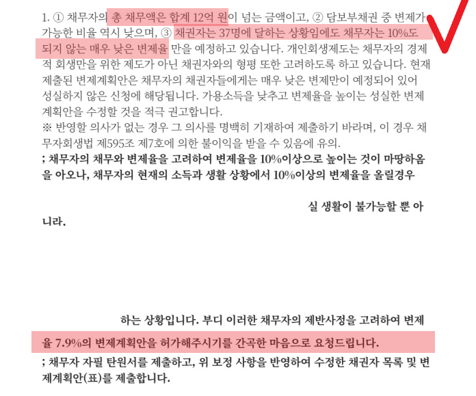 또한 법원에서는 너무 낮은 변제율에 변제율을 10% 이상으로 올리라고 권고하였으나, 저희 법무법인 글로리는 변제율을 10% 이상으로 올릴 경우 선모씨의 최소 생계비 보장이 어렵다고 판단하였고, 이에 신청인의 상황에 대하여 자세히 진술하며 변제율 7.9%를 주장하였습니다.