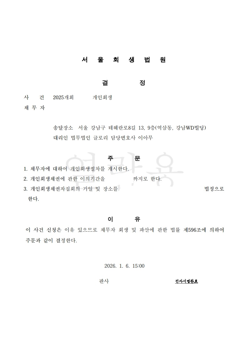 대출사기 피해로 인한 복잡한 채무 구조였기 때문에 고객님에게 불리하지 않도록 사건의 쟁점을 정리할 수 있었고 이를 법원에서는 합리적으로 받아들여 추가 보정없이 보정 1회만으로 개인회생절차 개시결정을 받게 도와드렸습니다.