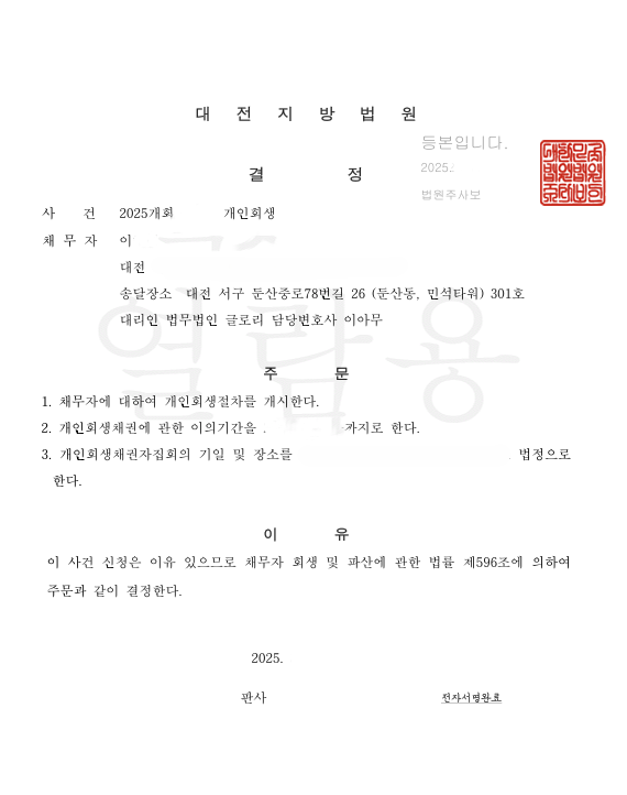 더불어 법원에서 내린 보정권고에 대해 소득 및 채무 사용처에 대해 객관적 자료 및 타당하고 상세한 소명을 통해 1회 보정만으로 개시결정이 내려졌으며, 보정권고일로부터 즉각적인 대처를 통해 곧바로 빠른 개시결정을 받을 수 있었습니다.