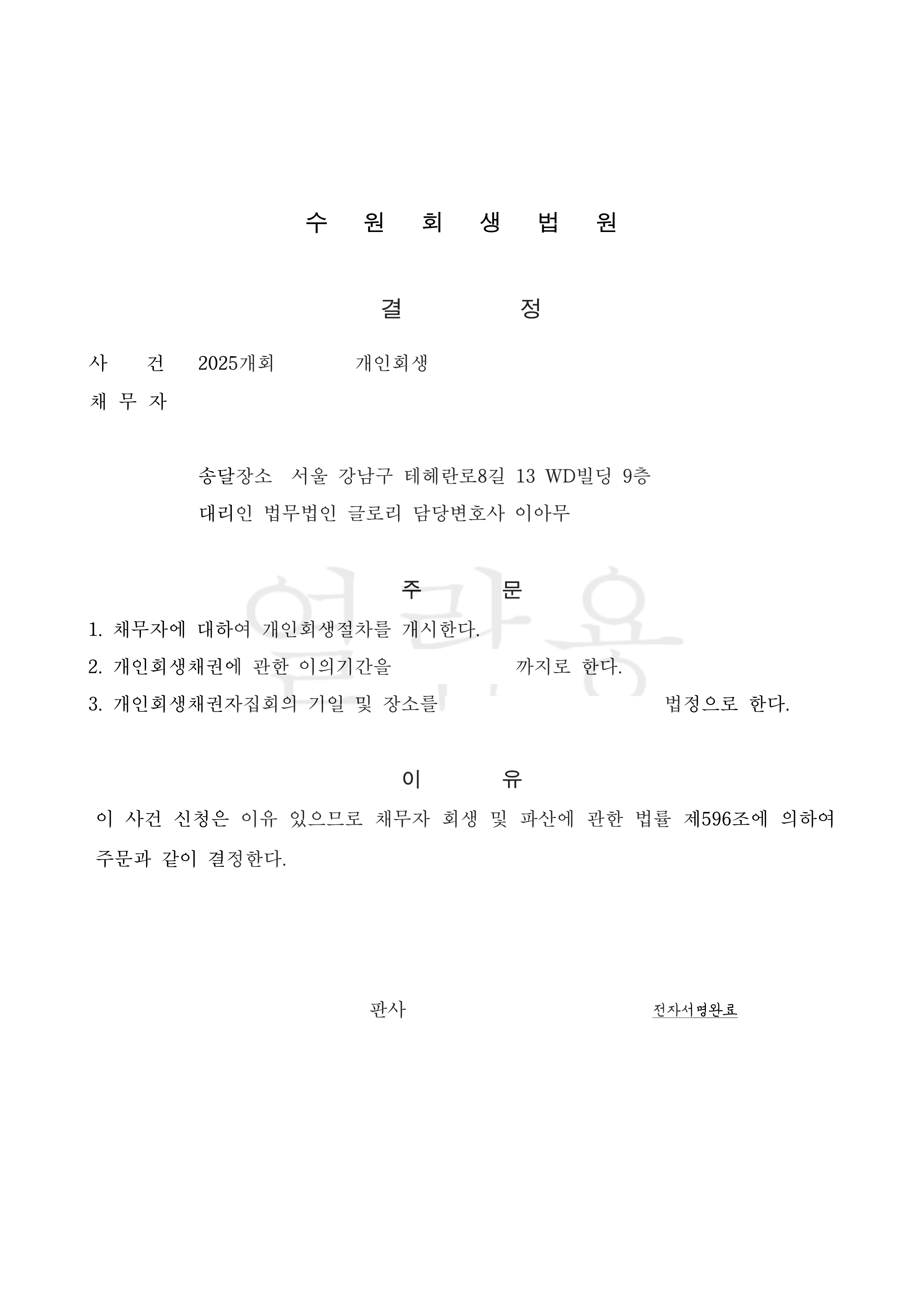 저희 글로리는 고객님이 가정을 유지하려 노력했던 과정부터 이혼 후 급격히 무너진 생활고, 그리고 보이스피싱 피해 경위를 객관적인 자료와 함께 구체적으로 정리했습니다. 특히 적은 소득임에도 불구하고 변제 의지가 확고하다는 점을 강조하여 법원의 이해를 이끌어냈습니다.