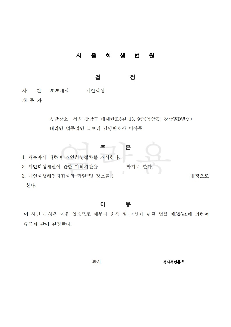 저희 법무법인 글로리는 사건별 특성에 맞춘 전략적인 대응을 통해 절차가 안정적으로 진행되고, 원활한 개시결정에 이를 수 있도록 조력하고 있습니다.