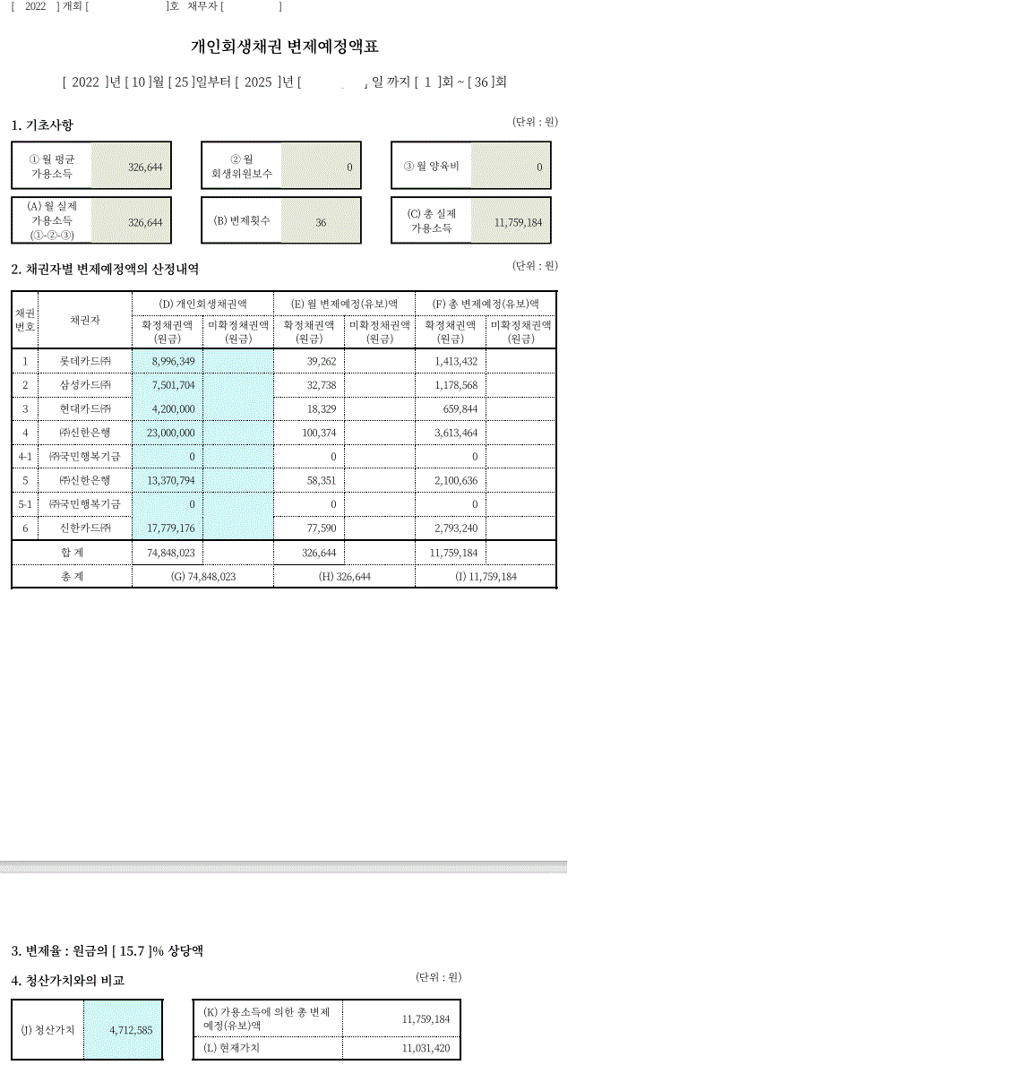 생계비주장으로 월 변제금을 30만원까지 낮출 수 있었습니다.