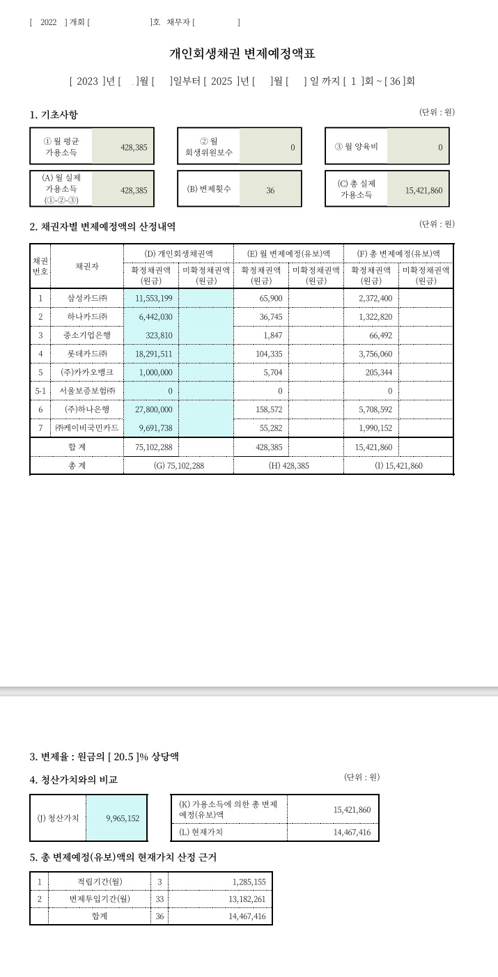 변제기간 60개월 월 변제금 90만원상당, 총 원금의 20%를 변제하는 좋은 조건의